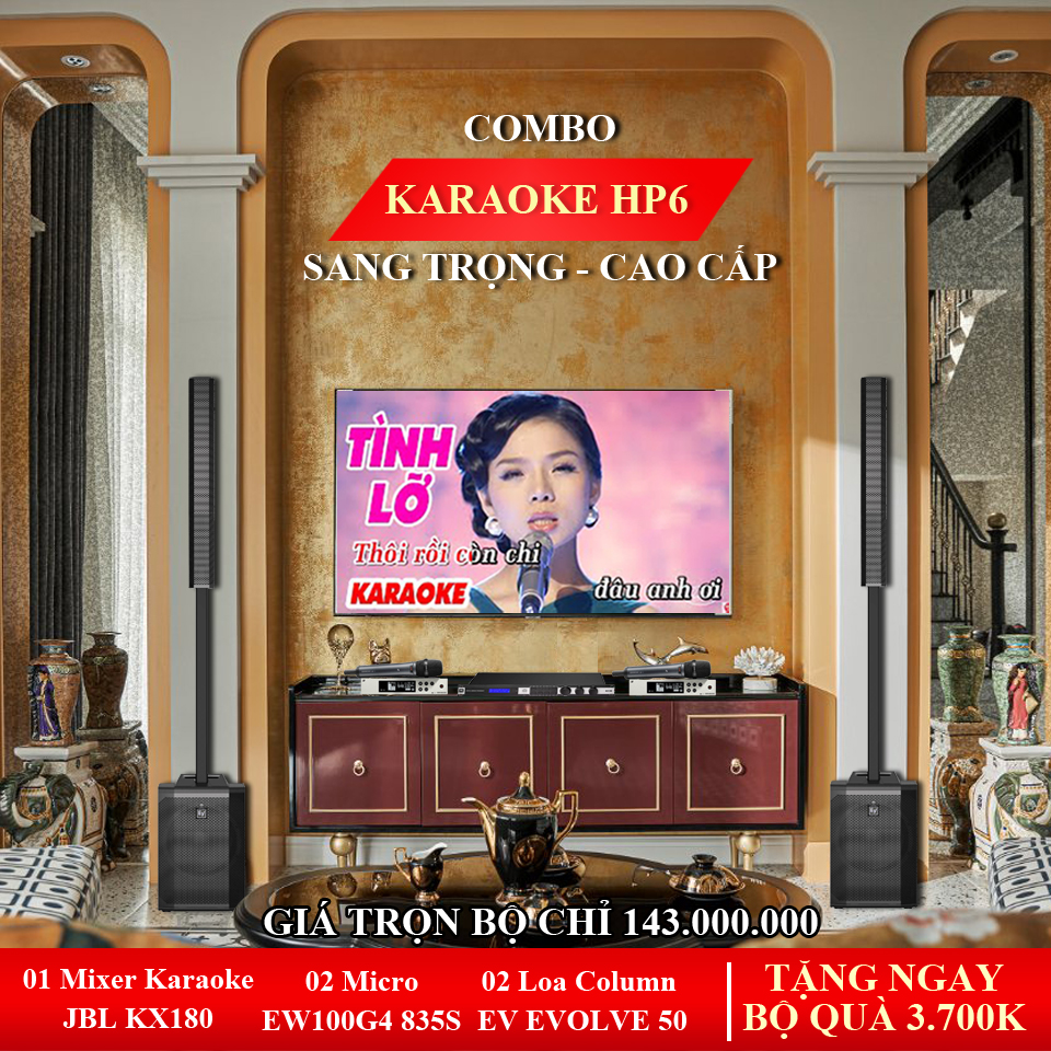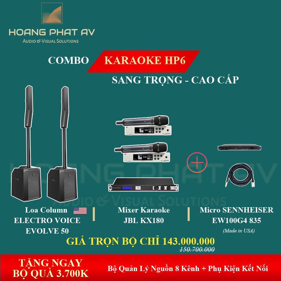 Bộ karaoke cao cấp HP6. Sự kết hợp của loa Electro-voice Evolve 50, micro Sennheier EW100G4 835 và mixer karaoke JBL KX180