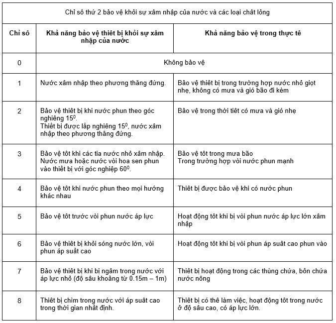 - Chữ số thứ hai được ký hiệu để chỉ mức độ bảo vệ thiết bị khỏi sự xâm nhập của nước